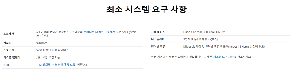 마이크로소프트에서 말하는 최소 사양은 아래와 같습니다.